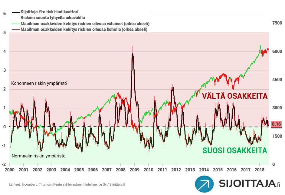 Sijoittaja.fi:n riski-indikaattori on edelleen nollarajan yläpuolella. Indikaattori on ollut ”vältä osakkeita” tasolla helmikuun alusta lähtien.