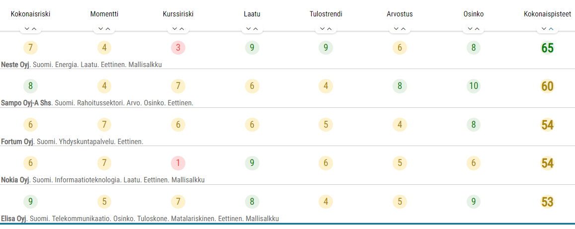 Osaketyökalustamme löytyy 116 kotimaista osaketta ja 1100 ulkomaista osaketta. Vertaile osakkeiden pisteytystä ja arvostuslukuja Osaketyökalulla.