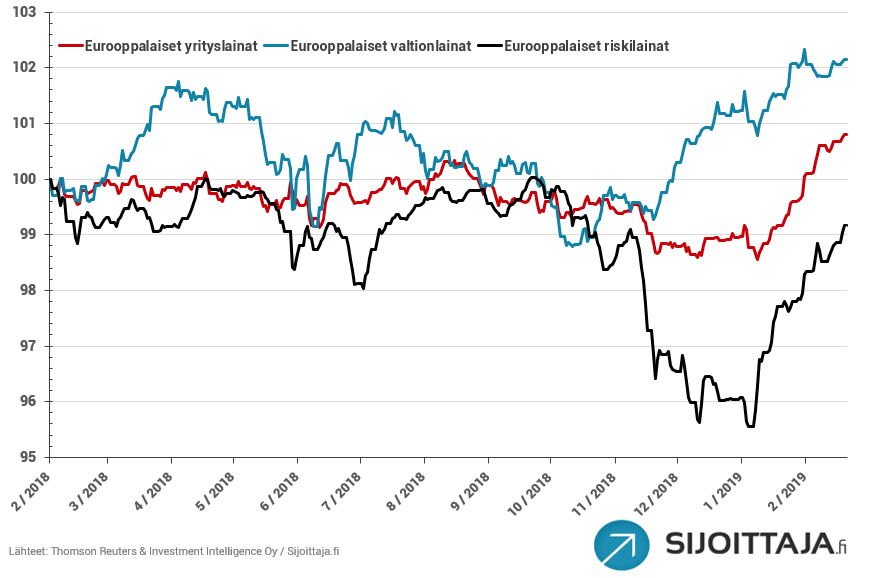 Eurooppalaisten korkosijoitusten tuottokehitykset kertovat, että riskilainat (high yield) laskivat selvästi loppuvuonna 2018, mutta ovat palautuneet alkuvuonna 2019 sijoittajien riskinottohalukkuuden palatessa. Vastaavasti valtionlainat nousivat jo loppuvuonna 2018, kun sijoittajat hakivat turvaa riskisijoitusten laskiessa. Valtionlainojen tuotto on jatkunut positiivisena, sillä odotukset korkotason noususta ovat edelleen laskeneet.