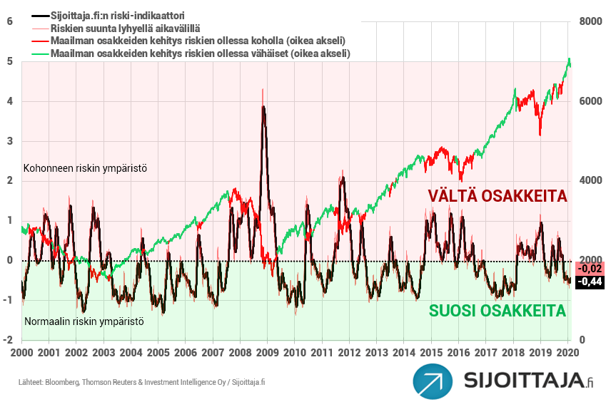 Sijoittaja.fi:n kokonaisriski-indikaattori kokoaa keskeiset riski-indikaattorit yhteen käyrään, jonka avulla sijoittajat voivat arvioida nopeasti ja helposti markkinoiden riskiympäristön kehitystä. Historiallisesti riskitason nousu yli nollarajan on usein tarkoittanut osakemarkkinoiden laskua. Paras ostopaikka osakemarkkinoilla on usein ollut jo silloin, kun riski-indikaattori on kääntynyt laskuun punaisella alueella.