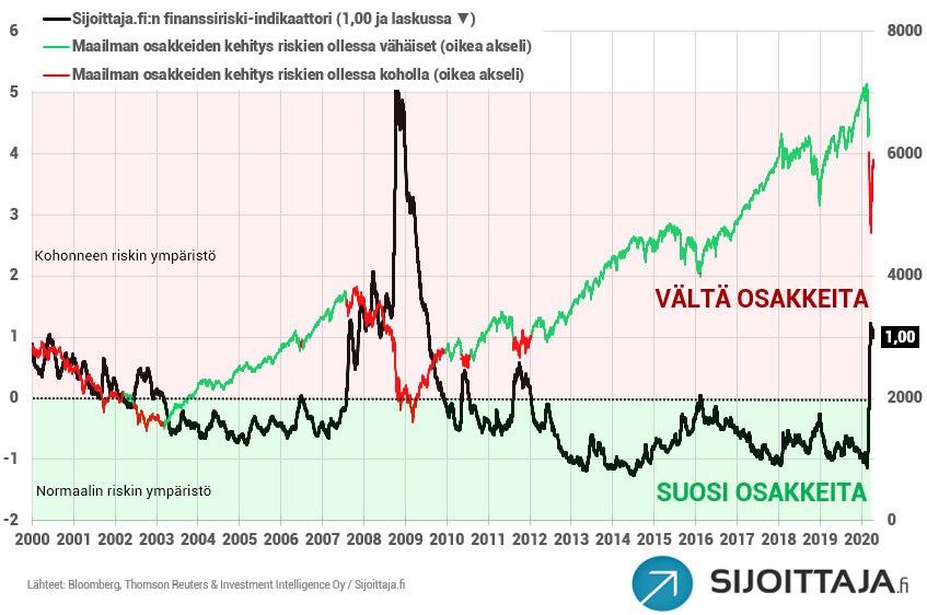 Sijoittaja.fi:n finanssiriskeistä kertova indikaattori kuvaa finanssisektorin riskien kehitystä. Finanssiriski-indikaattorin ollessa koholla se indikoi mahdollisia voimakkaita korjausliikkeitä osakemarkkinoille. Indikaattori (musta viiva) on nyt koronakriisissä poikkeuksellisen korkealla tasolla. Ainoastaan finanssikriisissä indikaattori on ollut korkeammalla.