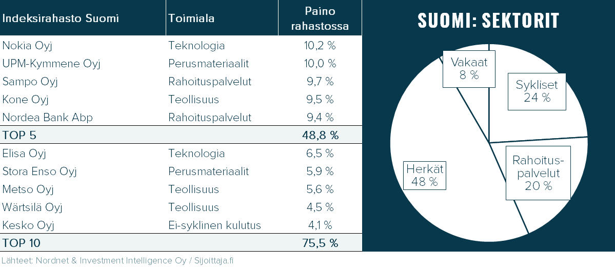 Ostaessasi rahastoa sijoitat Helsingin pörssin 25 vaihdetuimmista osakkeista ESG-kriteerit täyttäviin yhtiöihin markkina-arvon mukaisilla painoilla. Helsingin pörssissä kärkisijoilla lähes yhtä suurin painoin ovat Nokia, UPM-Kymmene, Nordea, Sampo ja Kone. Suomi on teollisuus- ja rahoituspainotteinen, teollisuuden paino on 30,0 % ja rahoitusalan paino 19,3 %. Rahaston suurin ongelma on Nordean ja Sammon yhteispaino, joka on 19,9 %.