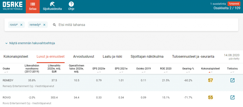 - Ennusteet, toteutuneet luvut, pisteytys ja arvostusluvut Osaketyökalusta