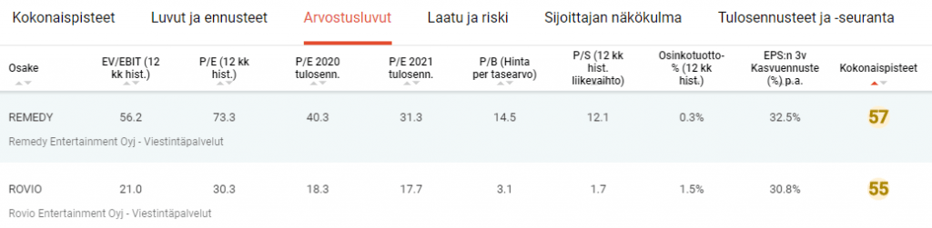 Remedy on pörssihistorian perusteella parempi. Liikevaihto on kasvanut yli 30 % vuosivauhtia, kun Roviolla liikevaihto on laskenut. Myös tulos on kasvanut voimakkaammin ja kannattavuus on ollut korkeampi. Analyytikot myös odottavat tuloksen kasvavan nopeammin.