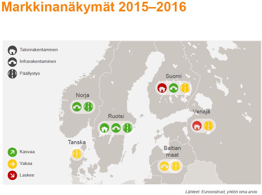 Lemminkäinen arvioi, että vuonna 2015 sen liikevaihto ei kasva vuoden 2014 tasosta (2 044,5 milj. euroa). Liikevoiton (IFRS) vuonna 2015 yhtiö odottaa paranevan vuoteen 2014 verrattuna (36,3 milj. euroa).
