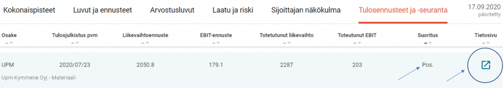 Osaketyökalussa mene Tulosennusteet ja -seuranta -välilehdelle. Lajittele osakkeet Suorituksen perusteella. Keskity positiivisen suorituksen yhtiöihin.