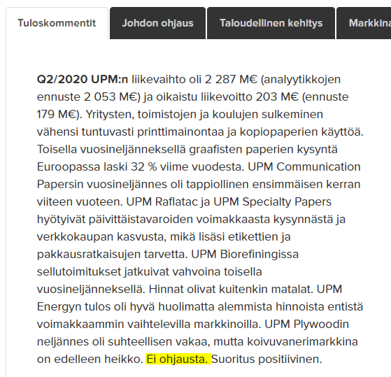Klikkaa tietosivua. Katso tuloskommentista, onko yhtiö antanut ohjausta. Jos ohjausta ei ole annettu, mutta yhtiö suoritutunut Q2:lla hyvin ja näkymät myönteiset, niin on todennäköistä, että ohjaus palautetaan.