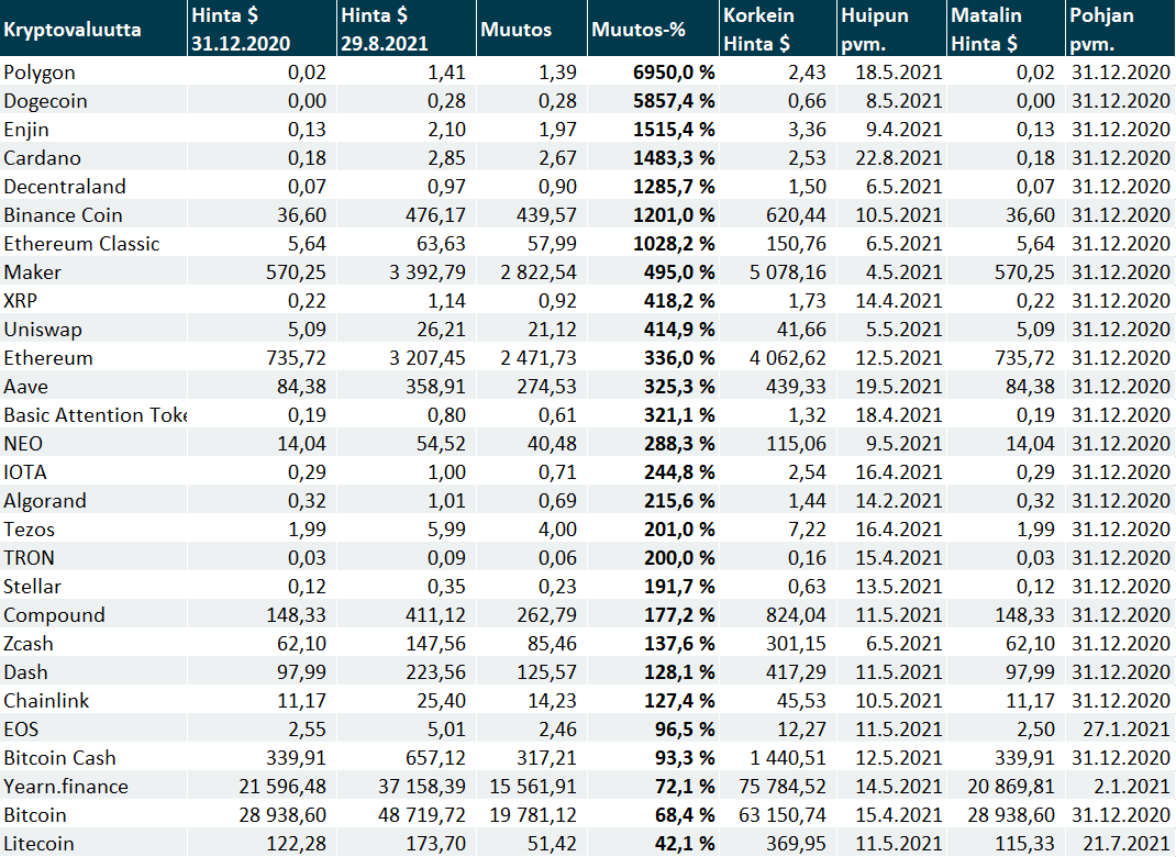 Eniten tuottaneet kryptovaluutat 1.1.-29.8.2021