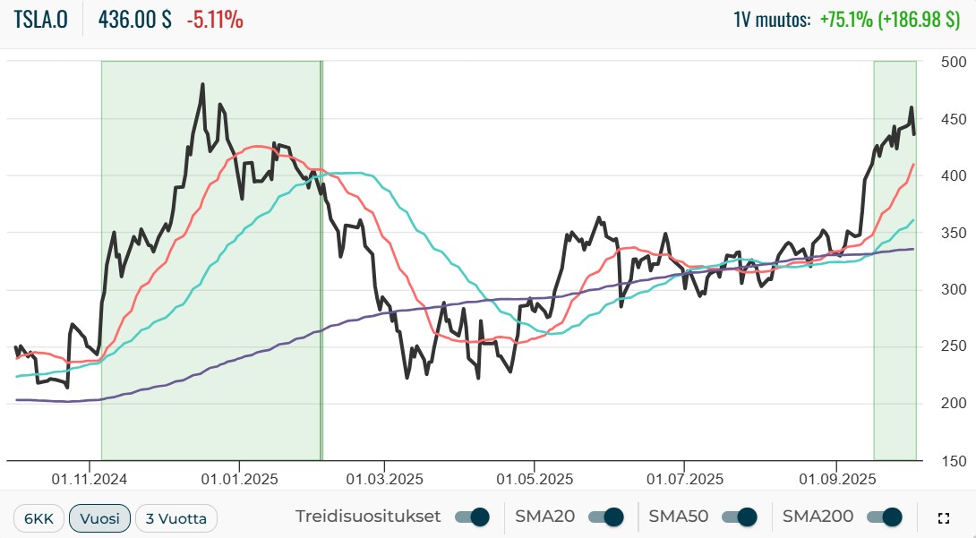 Kurssi nousi syyskuun aikana yli 30 prosenttia. Syyskuun kehitys nosti osakkeen Treidityökalumme tutkaan, joka antoi osakkeelle ostosignaalin 16. syyskuuta. Treidityökalun antaman aikaisemman treidi-ikkunan tuotot Teslan osakkeelle olivat +33 prosenttia koko treidi-ikkunan ajalta ja +66 prosenttia treidi-ikkunan huipulta. Vahva nousu nosti osakkeen teknisesti selvästi yliostetuksi lähestyttäessä kuun vaihdetta.