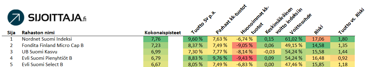 Vertailumme perusteella parhaat rahastot ovat: Nordnet Suomi Indeksi, Fondita Finland Micro Cap B, UB Suomi Kasvu, Evli Suomi Pienyhtiöt B ja Evli Suomi Select B. Kärkirahastoista Nordnetin rahasto on indeksirahasto, mutta muut rahastot ovat aktiivisesti hoidettuja rahastoja. Fondita Finland Micro Cap B ja Evli Suomi Pienyhtiöt B rahastot keskittyvät sijoitustoiminnassaan pääosin pienyhtiöihin.