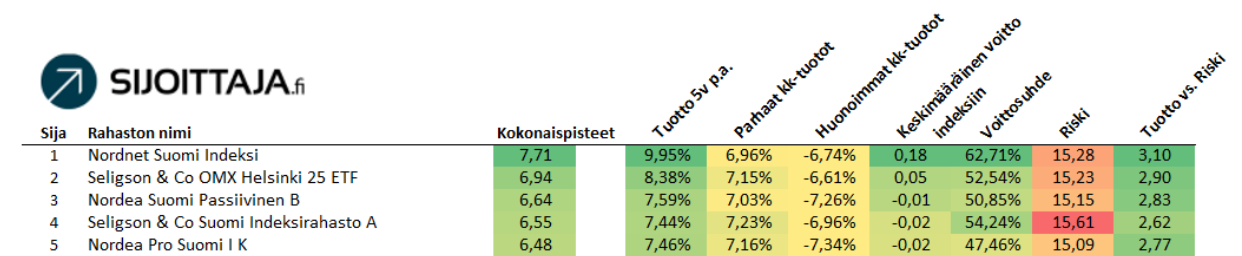 Nordnet Suomi Indeksi, Seligson & Co OMX Helsinki 25 ETF, Nordea Suomi Passiivinen, Seligson & CO Suomi Indeksirahasto ja Nordea Pro Suomi (4.3.2026 eteenpäin nimellä Nordea Finnish Enhanced). Kärkiviisikosta neljä ensimmäistä ovat indeksirahastoja ja pian nimensä muuttava Nordea Pro Suomi on aktiivisesti hoidettu rahasto.