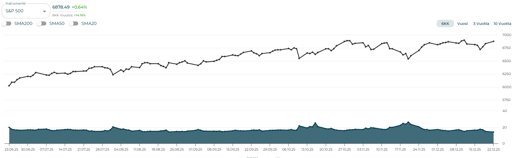 Myös keskeiset markkinaindeksit ovat viimeisen viiden päivän aikana plussalla ja markkinoiden nopeusmittarimme ”suosi osakkeita” -tasolla. S&P 500 -indeksi on palautunut pienestä kuopasta, mutta indeksin pitäisi nousta yli 6900 pisteen vuoden loppua kohden, jotta voitaisiin puhua joulupukkirallista. Nvidia ja muut AI-johtotähdet ovat avainasemassa markkinoiden joulupukkirallin näkökulmasta.