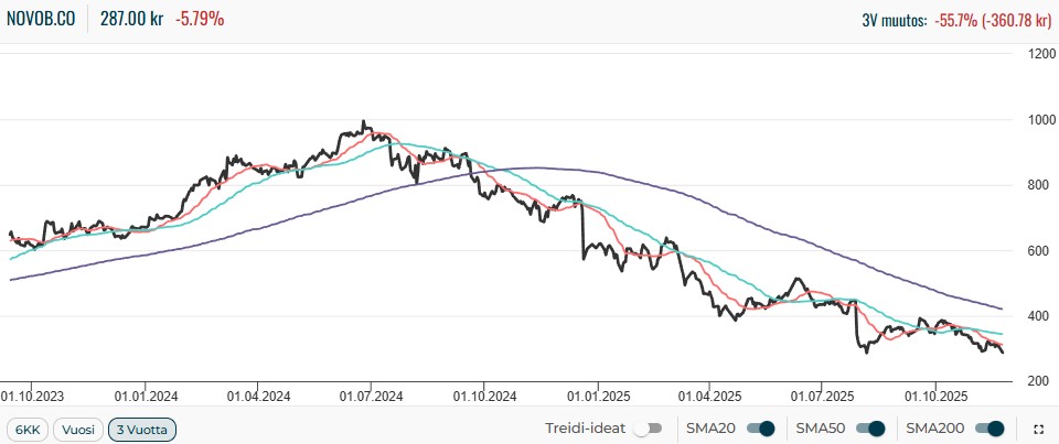 Viimeisimpänä käänteenä maanantaina 24.11. Novo Nordiskin osake oli jyrkässä laskussa, kun yhtiö kertoi Alzheimerin taudin lääkekokeidensa epäonnistuneen hidastamaan sairauden etenemistä. Tieto oli merkittävä isku Ozempic-laihdutuslääkkeestään tunnetulle yhtiölle, ja kurssi putosi hetkellisesti noin kymmenen prosenttia ennen sulkeutuen noin kuuden prosentin laskuun.