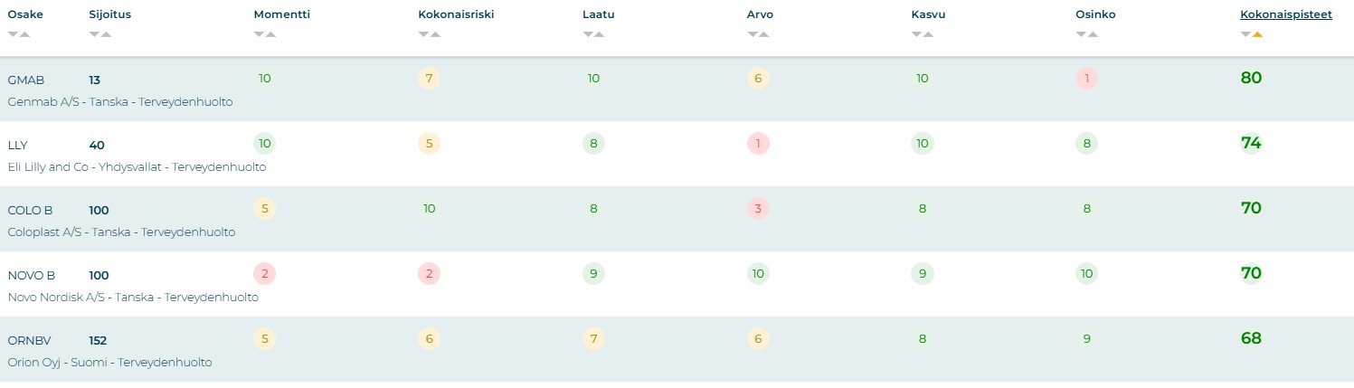 Vaikka osinko-, arvo- , laatu- ja kasvufaktorien pisteet ovat vahvat, kokonaispisteillä mitattuna Novo Nordisk saa tällä hetkellä toiseksi heikoimmat pisteet, kun sitä verrataan Pohjoismaisiin terveydenhuoltosektorin suurimpiin yhtiöihin ja kilpailija Eli Lillyyn. Yhtiön kokonaispisteitä laskevat erittäin alhaiset momentti- ja kokonaisriskipisteet. Yhtiön momenttipisteet ovat kurssilaskun jäljiltä matalalla tasolla. Liiketoimintaan ja osakekurssiin liittyvät riskit ovat myös korkeat.