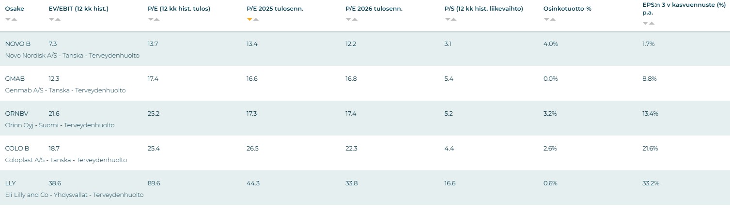 Kurssilasku on laskenut Novo Nordiskin osakkeen arvostuskertoimia selvästi, ja osake on houkutteleva, kun sitä verrattaan muihin suurimpiin Pohjoismaisiin terveydenhuoltosektorin yhtiöihin. Yhdysvaltojen kilpailija Eli Lillyyn verrattuna arvostus on selvästi matalammalla tasolla.