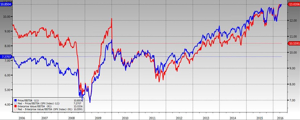Alla olevasta kuvaajasta voi puolestaan havaita, että Yhdysvaltain osakemarkkinoiden arvostustasot ovat nousseet jo korkeiksi, mikä yhdistettynä heikkoon tuloskehitykseen rajoittaa amerikkalaisosakkeiden nousupotentiaalia. Kuvaajassa sininen käyrä kuvaa S&P 500 -indeksin markkina-arvon suhdetta historialliseen 12 kuukauden käyttökatekehitykseen. Suhdeluku on tällä hetkellä noin 10,9, mikä on selvästi viimeisen 10 vuoden mediaania (7,3) korkeampi. Punainen käyrä puolestaan kuvaa nettovelatonta arvoa (EV) suhteessa historialliseen 12 kuukauden käyttökatteeseen. Viesti on jokseenkin sama: nykyinen noin 13 taso on selvästi mediaania (10,6) korkeampi.