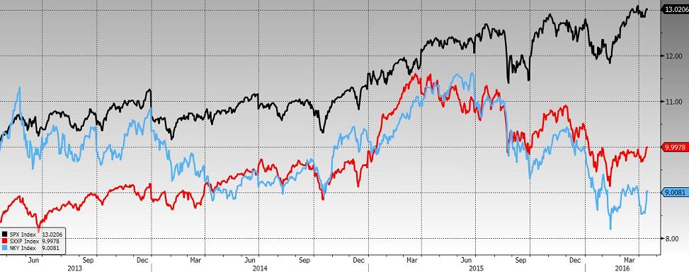 Tuloskauden alkumetrit on otettu Yhdysvalloissa ja tuleva viikko alkaa viitoittamaan, mihin suuntaan tuloskehitys ja -odotukset jatkavat. Päämarkkinoiden välisessä vertailussa Japanin osakemarkkinat vaikuttavat mielestämme edelleen houkuttelevimmilta arvostusmielessä (lue myös casemme japanilaisista osakkeista). Alla olevasta kuvaajasta voi havaita japanilaisten osakkeiden (sininen käyrä) arvostustasojen painuneen nettovelattoman yritysarvon ja edellisen 12 kuukauden käyttökatekertymän perusteella selvästi Eurooppaa (punainen käyrä) ja Yhdysvaltoja (musta käyrä) alhaisemmaksi.
