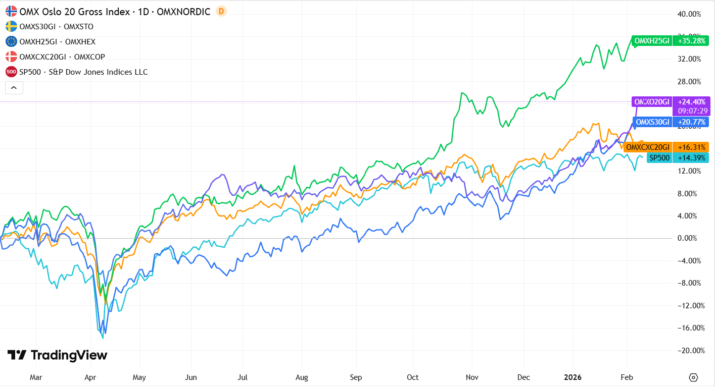 Viimeisen vuoden periodilla Oslon pörssi on tuottanut toiseksi parhaiten (+24,4 %). Ainoastaan Helsingin yleisindeksi OMXH25 on yltänyt kovempaan tuottoon (+34,3 %).