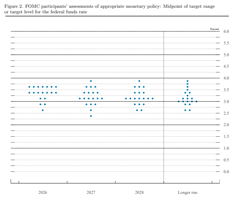 Alla olevasta Dot Plotista voidaan havaita, että maaliskuussa 2026 Fedin johtajat ennustavat pääsääntöisesti, että ohjauskorko on vuonna 2026 välillä 3,25-3,75. Ennusteiden mediaani ennakoi yhtä ohjauskoron laskua vuodelle 2026. Viisi johtajaa ennakoi aggressiivisempaa leikkaustahtia. Myös vuodelle 2027 mediaani ennustaa yhtä 0,25 prosenttiyksikön koronlaskua.