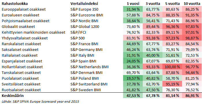 S&P:n tutkimus näyttää selvästi, mitä pidempää tarkastelujaksoa käytetään, sitä huonommin perinteiset euromääräiset rahastot onnistuvat voittamaan vertailuindeksin. Viime vuonna eurooppalaisiin osakkeisiin sijoittavista rahastoista vain 37,3 % hävisi indeksille. Kun tarkastelujaksoa pidennetään 3 vuoteen, vertailuindeksille hävinneiden rahastojen määrä lähes tuplaantuu (69,8 %). Mitä pidemmälle tarkasteluhorisonttia laajennetaan, sitä pienemmäksi satunnaisten onnistumisten merkitys jää. 5 ja 10 vuoden tarkastelujaksolla jo 75,2 % ja 85,9 % rahastoista tuottaa indeksiä vähemmän. Eli pitkässä juoksussa vain alle viidesosa aktiivisista rahastoista onnistuu voittamaan vertailuindeksinsä!