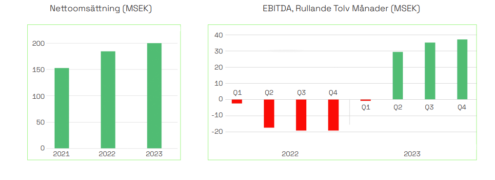 Kokonaisuudessaan vuoden 2023 liikevaihto kasvoi 201 MSEK:iin (185 MSEK), ja EBITDA parani huomattavasti 37 MSEK:iin (-19 MSEK) EBITDA-marginaalin ollessa 18 prosenttia (-10 %). Operatiivinen rahavirta oli vuoden aikana 16 MSEK (-18 MSEK).