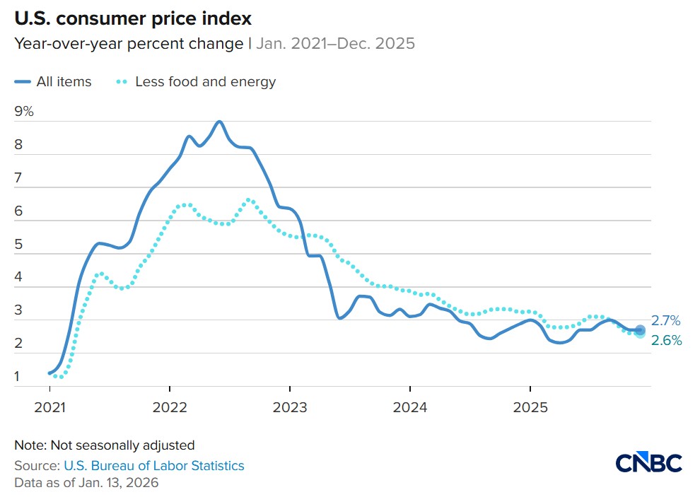 Joulukuussa Yhdysvaltojen kuluttajahintaindeksin (CPI) muutos vuodentakaiseen pysyi 2,7 prosentissa. Ekonomistit odottivat 2,7 prosentin inflaatiota, joten julkaistu luku osui odotuksiin. Ydininflaatio pysyi marraskuun tapaan 2,6 prosentissa, joka oli hieman vähemmän kuin ekonomistien odottama 2,7 prosenttia.