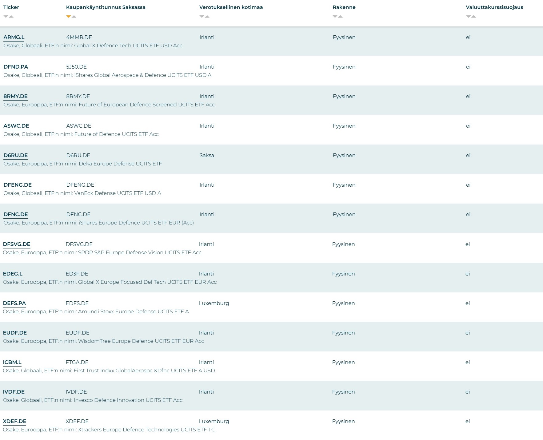 Viimeisen parin vuoden aikana markkinoille on listattu useita Eurooppa-listattua puolustussektorin ETF-rahastoja. Vertailussa 14 ETF-työkalusta löytyvää Eurooppaan listattua ETF-rahastoa, jotka sijoittavat puolustussektorin osakkeisiin.
