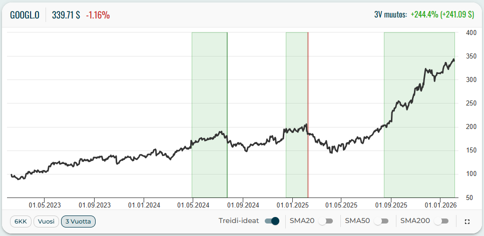 Googlen osake on ollut vahvassa nousutrendissä huhtikuusta 2025 lähtien. Treidityökalumme antoi osakkeelle suosituksen elokuussa. Treidi on edelleen aktiivinen ja nyt 64 % plussalla.