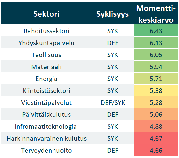 Parhaat momenttipisteet saavat syklinen rahoitus-, defensiivinen yhdyskuntapalvelu- ja syklinen teollisuussektori. Sijoittajat näyttävät edelleen suosivan talouskasvusta ja korkeammista koroista hyötyviä sektoreita, mutta yhdyskuntapalvelusektorin hyvä menestys viestii, että vakaus ja osinkotuotot ovat edelleen tärkeitä osalle sijoittajista. Toiset sijoittajat saattavat ostaa näitä osakkeita ennakoiden kasvavaa sähköntarvetta tekoälyboomin myötä. Tämä voisi vahvistaa yhdyskuntapalveluyhtiöiden voittoja ja osinkoja, tehden niiden osakkeista houkuttelevia, vaikka korot nousisivat.