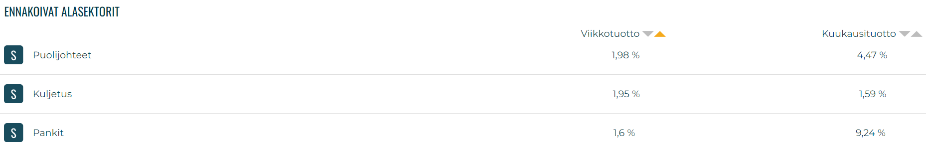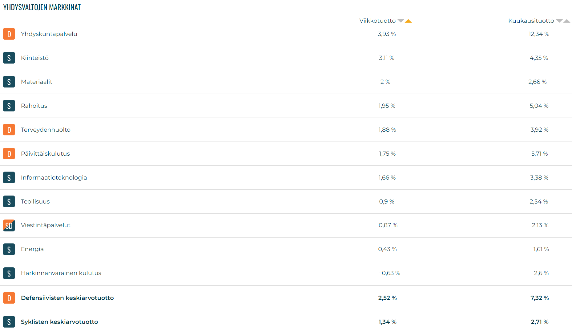 Lista on tällä viikolla kaksijakoinen. Parhaiten viikolla pärjäsivät defensiivinen yhdyskuntapalvelu, sekä sykliset kiinteistö- ja materiaalisektorit. Heikoiten viikolla pärjäsivät sykliset harkinnanvarainen kulutus-, ja energiasektori. Kuukausitarkastelussa defensiiviset ovat pärjänneet syklisiä sektoreita paremmin, erityisesti yhdyskuntapalvelusektorin vetämänä.