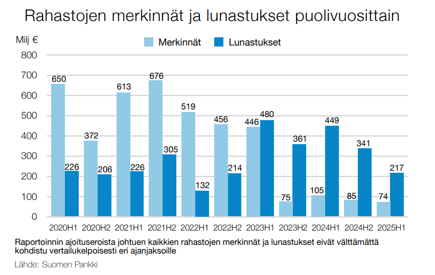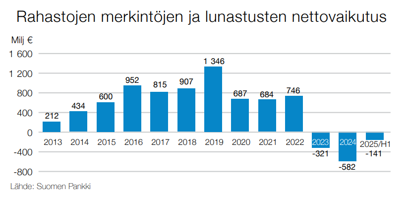 Esimerkiksi vuoden 2024 aikana rahastojen merkintöjen määrä oli vain 190 miljoonaa euroa, lunastusten ollessa 790 miljoonan euron tasolla. Lunastusten määrä laski viime vuonna hieman vuoden 2023 yhteenlasketusta 841 miljoonasta eurosta. Sama trendi jatkui myös vuoden 2025 ensimmäisellä puoliskolla lunastusten määrän laskiessa edelleen 217 miljoonaan euroon vertailukauden 449 miljoonasta eurosta.