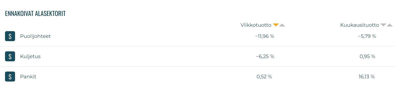 Sijoittaja360:ssa voi tutkia myös sektoreiden kehitystä. Viimeisen viikon aikana nimenomaan teknologiaosakkeet ovat olleet selvästi heikoin suoriutuja. Teknologiasektori on laskenut yli 7 prosenttia viikon aikana. Ennakoivissa alasektoreissa AI-megatrendistä hyötyvät puolijohdeosakkeet ovat laskeneet vielä rajummin. Peräti 12 prosenttia laskua viikon aikana.