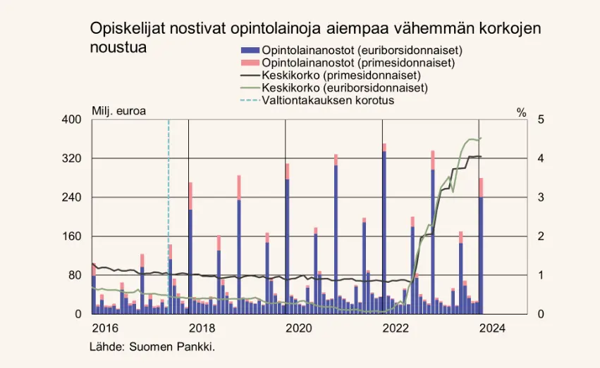 Opintolainan valtiontakauksen määrä nousi elokuussa 2024 aikaisemmasta 650 euron kuukausitasosta 850 euroon per opintotukikuukausi. Opiskelijat voivat siis nostaa aiempaa enemmän opintolainaa. Opintolaina on osa opintotukea, johon kuuluu lainan lisäksi myös opintoraha.