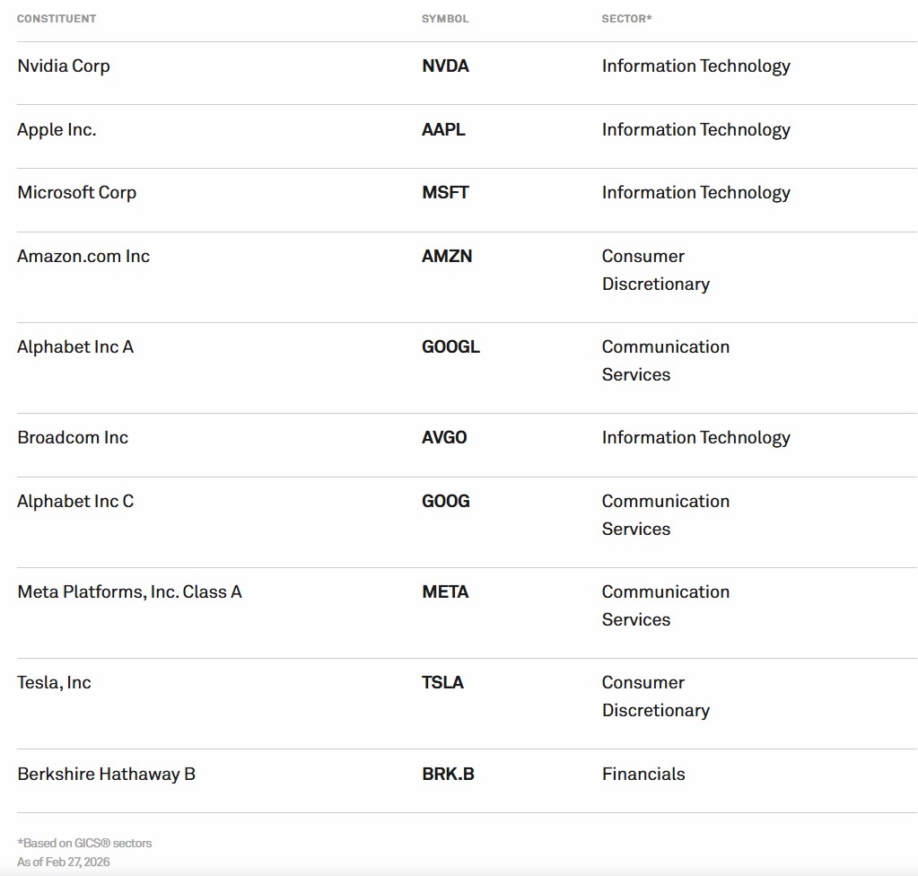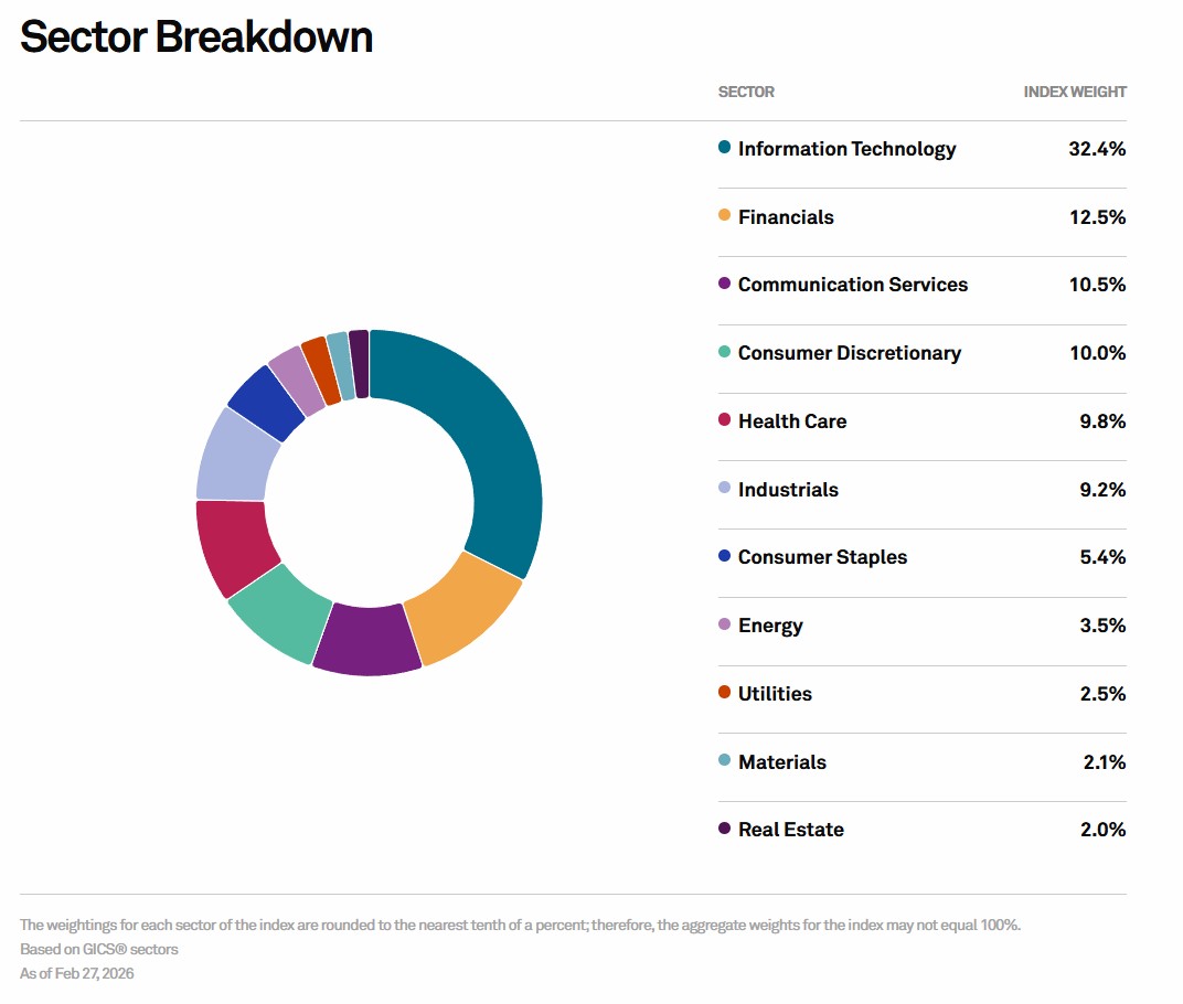 S&P 500 -indeksin osakkeet jakautuvat sektoreittain alla olevan kuvaajan mukaisesti. Eri osakesektoreiden osuudet on ilmoitettu indeksin painossa, eli kuvaaja ei kerro suoraan, kuinka suuri osa osakkeista kuuluu mihinkin sektoriin. Helmikuun 2026 lopussa S&P 500 -indeksin selvästi suurin paino oli informaatioteknologiasektorin osakkeissa.