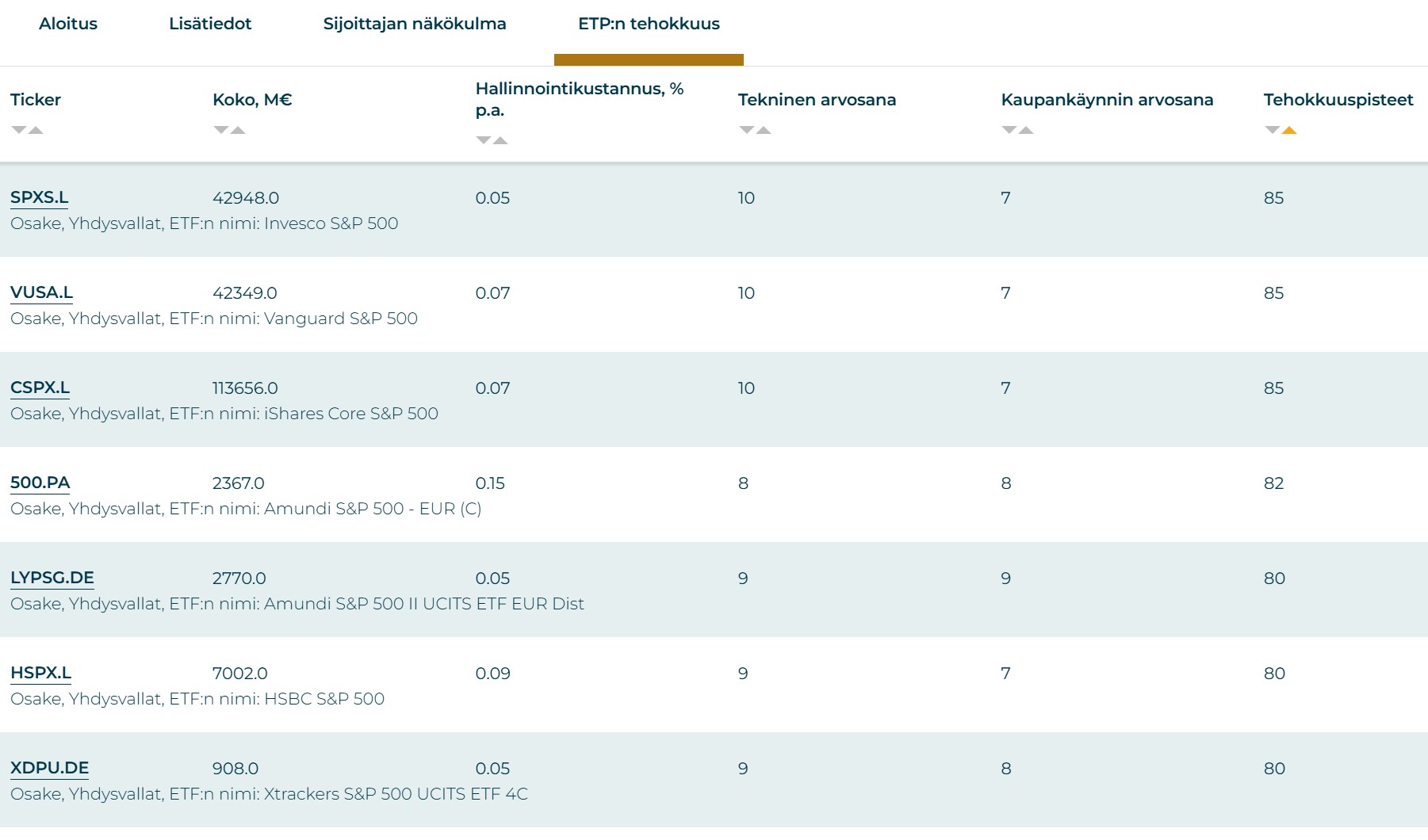 Täysin S&P 500-indeksin tuottoa seuraavia Eurooppa-listattuja ETF-rahastoja löytyy työkalusta useita, mutta tässä esimerkkinä seitsemän hyvät tehokkuuspisteet saanutta ETF:ää. Vaikka kaikki saavat tehokkuuspisteytyksessä yli 80 pistettä, on esimerkiksi rahastojen hallinnointikustannuksissa selviä eroja. Vuotuiset hallinnointikustannukset vaihtelevat 0,05 prosentista aina 0,15 prosenttiin. Osa listan ETF:istä on rakenteeltaan fyysisiä, eli ne omistavat suoraan indeksin mukaiset arvopaperit, kun taas osa on synteettisiä. Fyysisen ja synteettisen ETF:n eroista saat lisätietoa täältä.