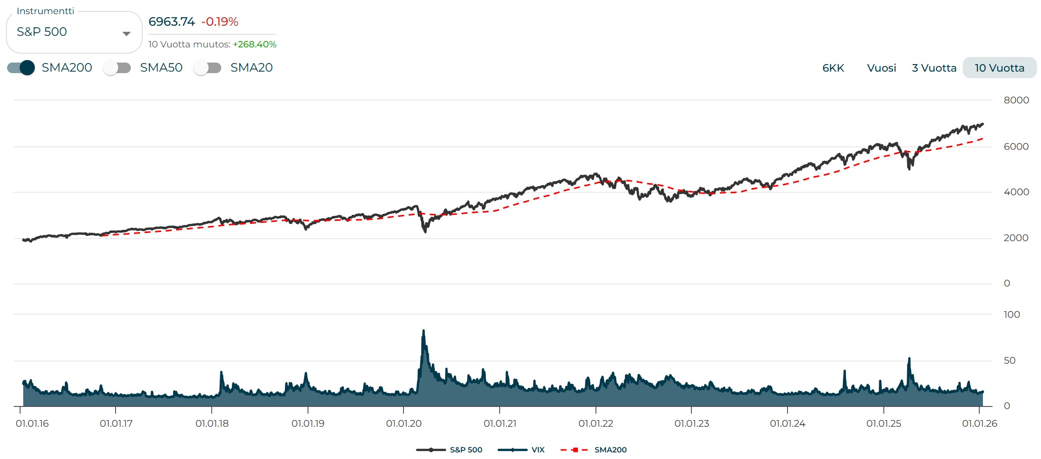 S&P 500 -indeksin historiallinen kehitys on vakuuttavaa katseltavaa. Viimeisen 10 vuoden aikana indeksi on tarjonnut 13 prosentin vuotuistetun tuoton. Indeksi on tänä aikana kokenut kolme merkittävää laskujaksoa, jolloin indeksi on pudonnut selvästi alle 200 päivän liukuvan keskiarvon. Koronakriisi, joka oli syvin, mutta nopea pudotus. Vuosien 2022-2023 inflaatiopiikistä aiheutunut lasku sekä kevään 2025 kauppasotalasku.
