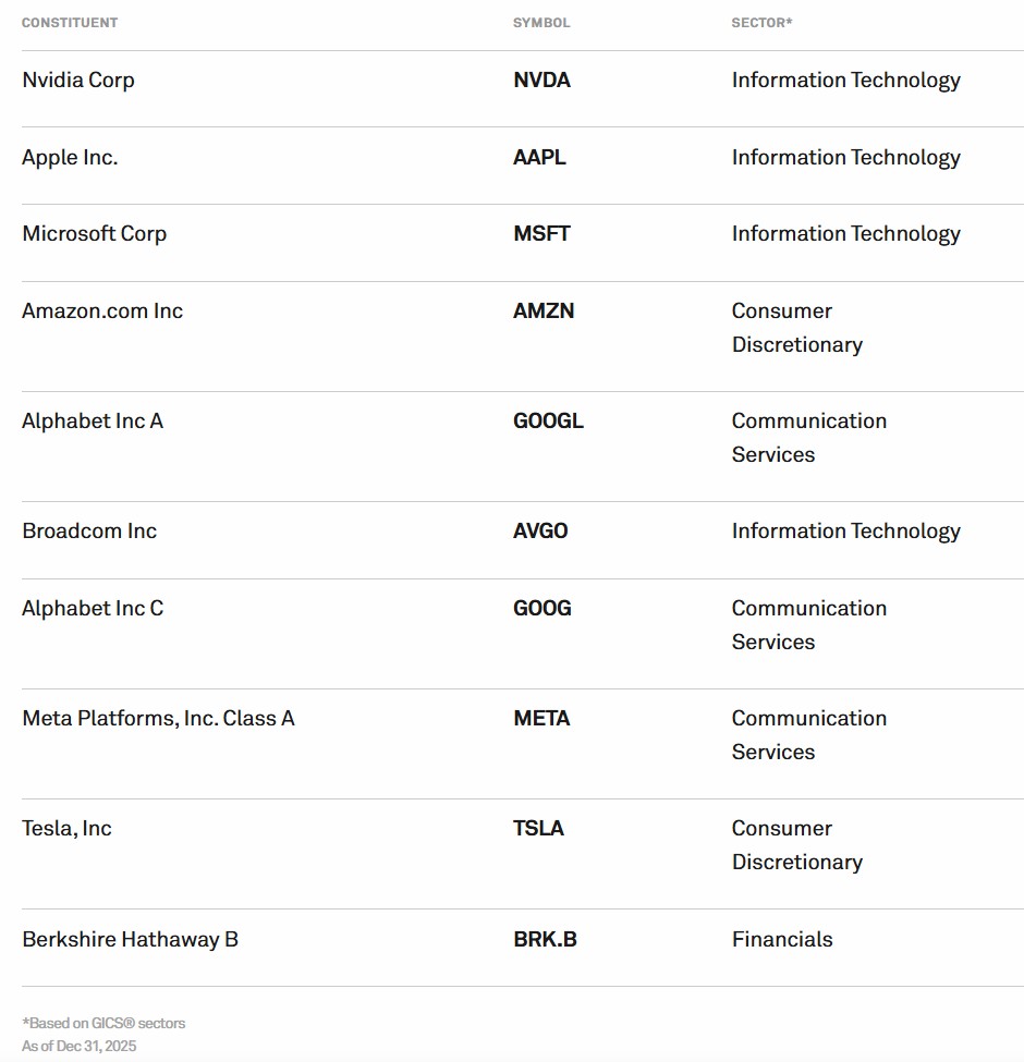 Artikkelin kirjoitushetkellä omistukseltaan S&P 500-indeksin viisi suurinta osaketta ovat Nvidia, Apple, Microsoft, Amazon ja Alphabet. Ajantasaiset sektoripainot sekä indeksin osakelista löytyvät S&P Globalin verkkosivuilta.