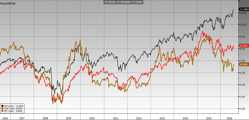 Japanissa tulosodotukset ja toteunut tulos ovat voimakkaasti laskusuunnassa. Tuloskaudesta tuli loppujen lopuksi kohtalaisen hyvä Japanissakin. Päämarkkinoiden välisessä vertailussa Japanin osakemarkkinat vaikuttavat mielestämme edelleen houkuttelevimmilta arvostusmielessä (lue myös casemme japanilaisista osakkeista). Alla olevasta kuvaajasta voi havaita japanilaisten osakkeiden (ruskea käyrä) arvostustasojen painuneen markkina-arvon ja edellisen 12 kuukauden käyttökatekertymän perusteella selvästi Eurooppaa (punainen käyrä) ja Yhdysvaltoja (musta käyrä) alhaisemmaksi.