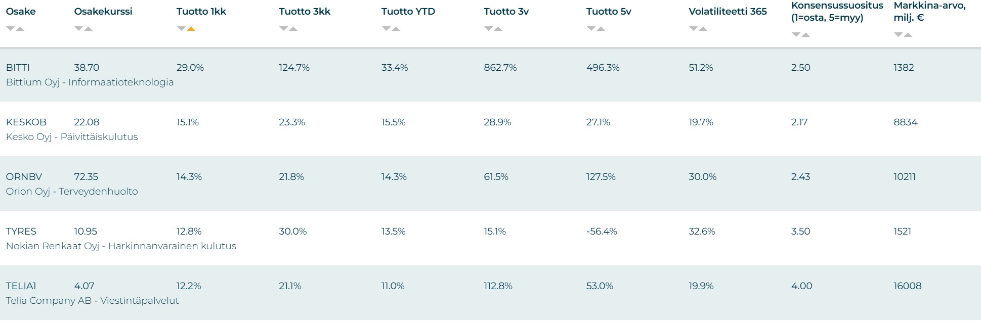 Viisi parasta osaketta näillä kriteereillä ovat: Bittium, Kesko , Orion, Nokian Renkaat ja Telia.