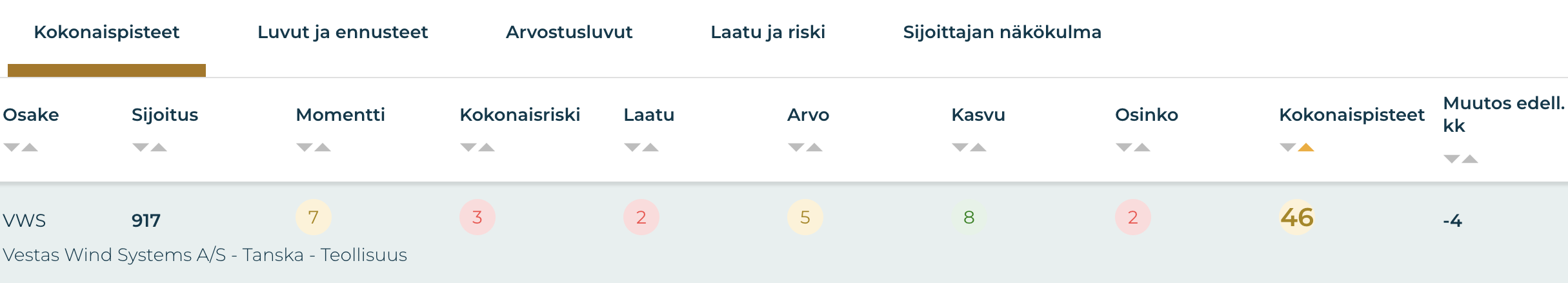 Vestas Wind Systems saa Osaketyökalussa hieman keskivertoa matalammat kokonaispisteet (46/100). Yhtiö erottuu edukseen erityisesti kasvupisteillään (8), jotka heijastavat uusiutuvan energian megatrendiä ja Vestasin laajaa tilauskantaa (67,3 mrd €). Myös momentti (7) on koholla – osake on noussut 26 % kolmessa kuukaudessa, ja tekninen kuva viittaa nousutrendin alkuun. Vakavaraisuuspisteet (7) kertovat terveestä taseesta ja hyvästä likviditeetistä. Sen sijaan laatu (2) ja osingon vakaus (1) jäävät selvästi heikoiksi. Kannattavuus on edelleen matala (EBIT-% 1,5 % Q2/25), eikä osingolla ole merkittävää roolia (0,6 % tuotto). Riskipisteet (3) kuvastavat toimialan volatiliteettia, regulaatioriippuvuutta ja yhtiön herkkyyttä kustannusmuutoksille.