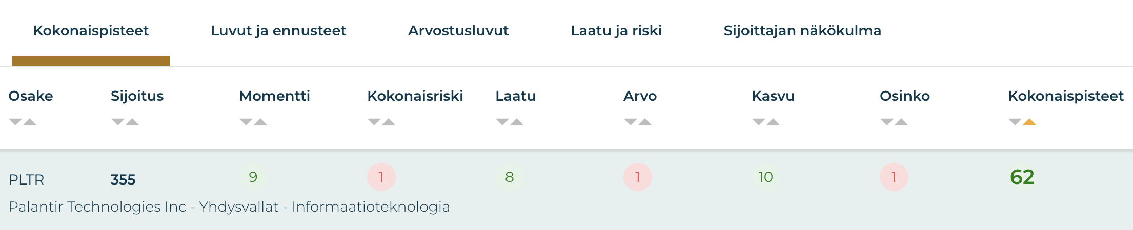 Olemattoman osingon lisäksi osakkeen selkeimmät heikkoudet pisteytyksen perusteella liittyvät arvostukseen ja riskitasoon. Palantir on hinnoiteltu poikkeuksellisen korkeilla kertoimilla (P/E 2025e: 278,5). Paisunut hinta jättää ei juurikaan jätä tilaa tulospettymyksille ja tekee osakkeesta hyvin herkän tulospettymyksille ja sijoittajien luottamusta horjuttaville uutisille. Osakkeen volatiliteetti on korkea (66 prosenttia), ja lyhyellä aikavälillä sijoittaja altistuu nopeille kurssiliikkeille.