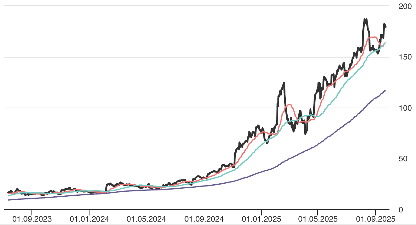 Elokuun alussa järkälemäinen tilauskannan kasvu sai Palantirin osakkeen raketoimaan jälleen. Kurssi nousi uusiin historiallisiin lukemiin 187 dollarin tuntumaan venyen samalla reippaasti yliostetun puolelle. Odotetavissa ollut korjaus pysähtyi SMA50:n tukitasolle. Osake kääntyi tukitasolta takaisin nousuun, mutta ei ole ainakaan vielä yltänyt elokuun huippulukemiin.