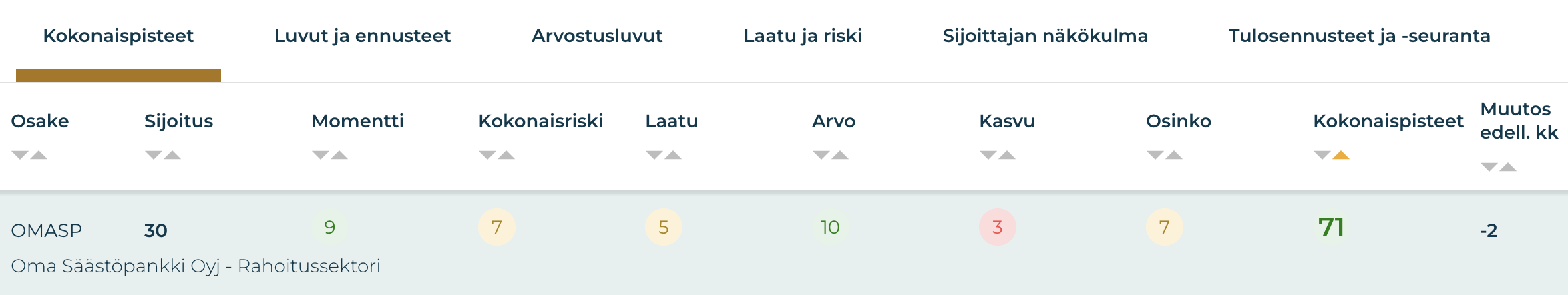 Oma Säästöpankki saa Osaketyökalussa vahvat kokonaispisteet (71/100). Osakkeen sijoitusprofiili rakentuu erityisesti arvostuksen (10/10) ja momentin (9/10) varaan. Osake on noussut kolmessa kuukaudessa +39 % ja arvostuskertoimet ovat selvästi alle sektorin keskiarvon. Myös osinkokategoria (7/10) ja vakavaraisuus (8/10) tukevat sijoitusprofiilia: yhtiön tavoitteena on maksaa tasaista ja kasvavaa osinkoa, ja sen pääomapuskurit ovat viranomaisvaatimuksia korkeammat.