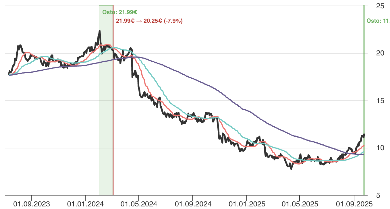 Harkinnan arvoisia tukitasoja voivat tarjota elokuun huippu (10,24 euroa) taikka SMA20 (10,26 euroa), jos osake korjaa suhteellisen nopeasti. Jos taas SMA50 ehtii nousta elokuun huipun yläpuolelle enne kurssin kohtaamista, voi se toimia herkullisena ostopaikkana mahdollisesta käänteestä hyötymään haluavalle sijoittajalle.