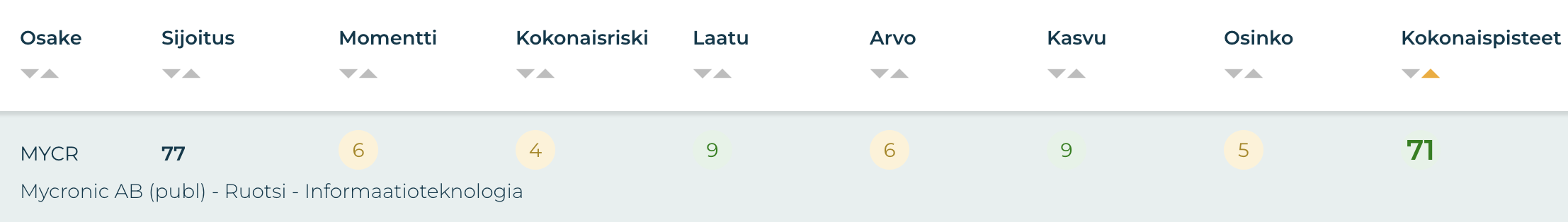 Sijoittajan näkökulmasta Mycronic vaikuttaa erityisen houkuttelevalta joukon matalimmalla volatiliteetilla (33,2 prosenttia), edullisimmalla arvostuksella (EV/EBIT: 16,6 ja P/E(2025e): 24,4) ja 2,1 prosentin osinkotuotolla. Siinä missä pienemmän kokonsa vuoksi Mycronic voidaan nähdä riskillisempänä sijoituskohteena, vaikuttaa se puhtaasti tunnuslukujen valossa muita osakkeita houkuttelevammalta. Niimpä Mycronic ansaitsee itselleen joukkion korkeimmat pisteet Osaketyökalussa ja parhaan konsensusluokituksen analyytikoiden arvioinnissa.