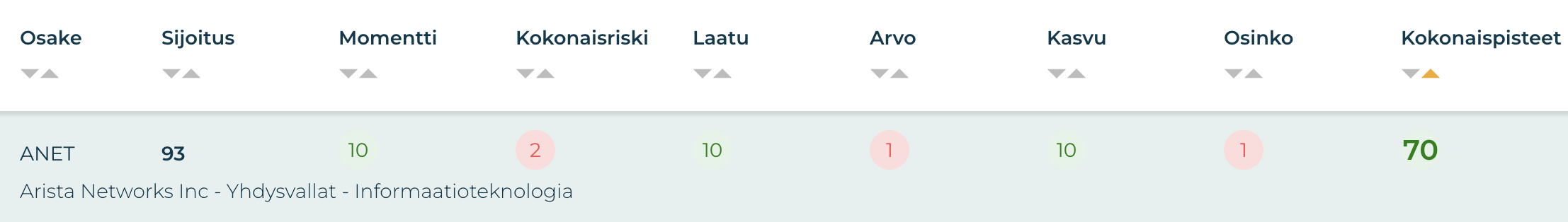 Arista profiloituu Cadencen tavoin liiketoiminnan kovaan kasvuun (10) ja laatuun (10) nojaavaksi osakkeeksi, jonka momentti (10) on viimeaikaisten hintaliikkeiden ansiosta erittäin vahva. Osakkeen nousu huhtikuun pohjalta nykypäivään on kerryttänyt 122 prosentin tuotot, ja EPS:n kolmen vuoden kasvuennuste sijoittuu analyysin osakkeiden joukossa Cadencen jälkeen toiseksi korkeimmalle tasolle 20 prosentilla. Myöskään Arista ei maksa osakkeenomistajille osinkoa. Markkinoiden kasvuodotukset heijastuvat osakkeen hintaan ja korottavat tulosperustaisia arvostuslukuja (EV/EBIT: 47,2 ja P/E(2025e): 50,8). Arvostus altistaa osakkeen korostuneille hintaliikkeille, mikä näkyy muun muassa osakkeen korkeassa volatiliteetissa: 53,4 prosenttia.