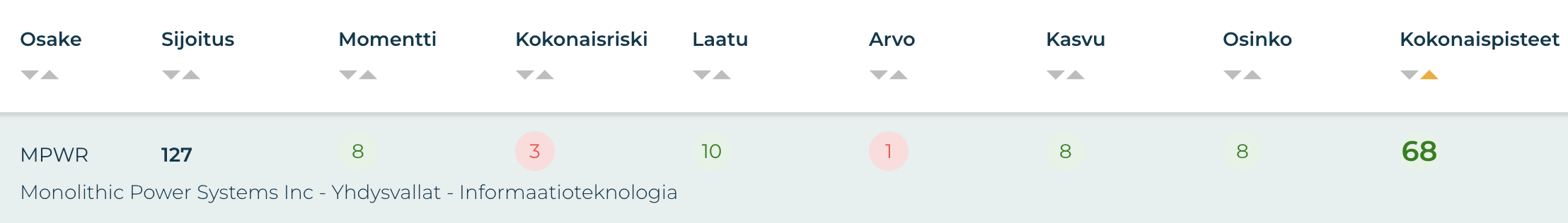 Nimestään huolimatta Monolithic Power Systems on analyysin yhdysvaltalaisista yhtiöistä pienin sekä markkina-arvolla että liikevaihdolla mitattuna. Silti se maksaa vakaata ja kasvavaa osinkoa 0,7 prosentin osinkotuotolla, toisin kuin monet suuremmista verrokeistaan. Osake on tuottanut huhtikuun pohjalta noustessaan noin sadan prosentin tuotot ansaiten vahvan pisteytyksen momentin osalta. Kasvupisteytys pysyy liikevaihdon kasvun voimin korkeana huolimatta osakekohtaisen tuloksen negatiivisesta ennusteesta.