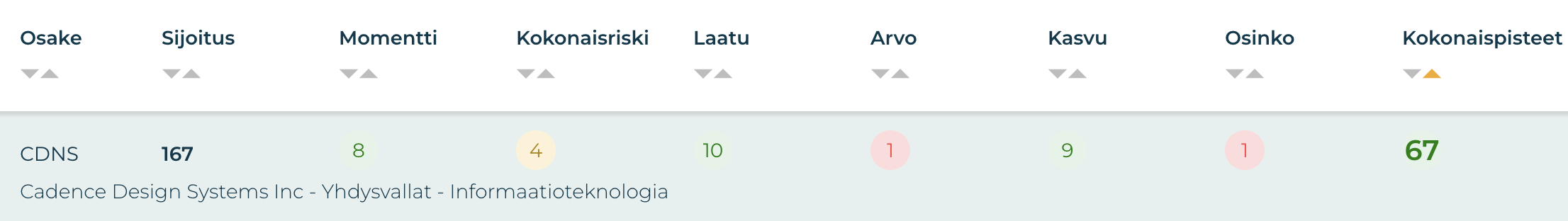 Cadencen osakkeen sijoitusprofiili rakentuu segmentille tyypilliseen tapaan vahvan kasvun (9), laadukkaan liiketoiminnan (10) ja kohonneen momentin (8) päälle. Osake on tuottanut huhtikuussa alkaneen nousun aikana yli 50 prosentin tuotot ja erottuu edukseen analyysin osakkeista joukon korkeimmalla osakekohtaisen tuloksen kolmen vuoden kasvuennusteella (31,6 prosenttia p.a.). Osinkoa kasvupainotteinen yhtiö ei maksa, ja tulokseen suhteutettu arvostus on korkea (EV/EBIT: 57,1 ja P/E(2025e): 50,7). Korkea arvostus näkyy myös osakkeen viimeisen vuoden hintaliikkeisiin pohjautuvassa volatiliteetissa: 38,6 prosenttia.
