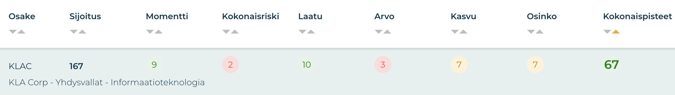 KLA:n toteutunut kasvu on kuuden osakkeen joukosta heikoin. Osake on ainoa analyysin osakkeista, jonka liikevaihdon kolmen vuoden liukuva vuosikasvu jää alle kymmeneen prosenttiin. Toisaalta liikevaihdolla mitattuna KLA on joukon yhdysvaltalaisista osakkeista tällä hetkellä suurin. Osake loistaa vahvalla momentilla (9) ja liiketoiminnan laadukkuudella (10). Osakkeen arvo on noussut huhtikuun pohjaltaan nykypäivään yli 80 prosenttia. Lisäksi yhtiö maksaa osinkoa 0,6 prosentin osinkotuotolla, jolla se erottuu vahvempia kasvulukuja kantavista vertailukohteistaan.