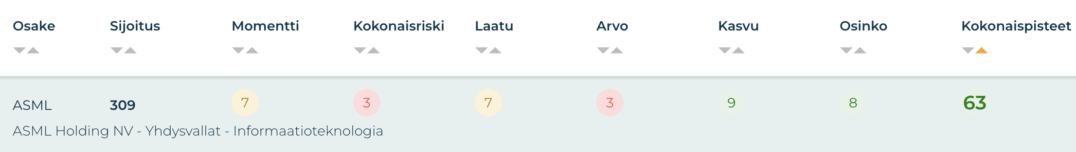 ASML on markkina-arvoltaan ja liikevaihdoltaan huomattavasti muita osakejoukon osakkeita suurempi toimija. Osake erottuu kuuden osakkeen joukosta erityisesti lyhyen aikavälin tuotoillaan. Analyytikoiden ja markkinoiden odotukset ASML:n suhteen ovat kohentuneet huomattavasti syyskuussa. Puolijohteiden kysynnän ennustetaan kasvavan huomattavasti, mikä tietenkin tulisi näkymään myös ASML:n tuloksessa kriittisen asemansa ansiosta. Osakkeen arvo on noussut viimeisen kolmen viikon aikana noin 30 prosenttia.